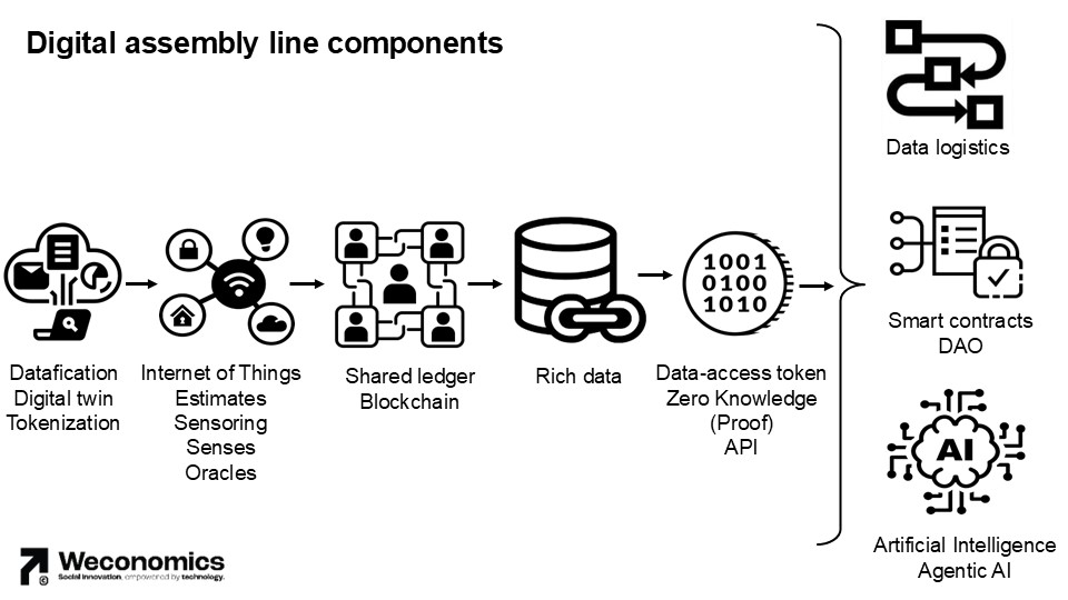 - Datafication: first you need to represent physical values (product, services, rights, measurements, Real World Assets etc.) and processes with zeros and ones (datafication, digital twin, tokenization).